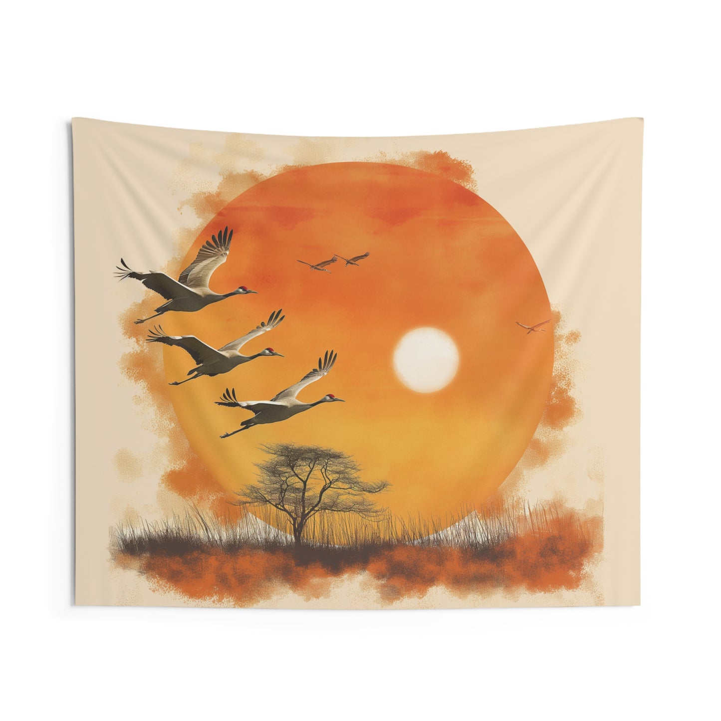 Flying Cranes against a backdrop of the sun over a wide horizon is featured on this nature inspired indoor wall tapestry. This 100% Polyester wall tapestry comes with hemmed edges for extra durability to ensure years' worth of decorating bliss. Great home decor idea for dorms, bedrooms, craft rooms, etc. Cranes are symbols of good omens in many cultures. Printed with a high resolution image.