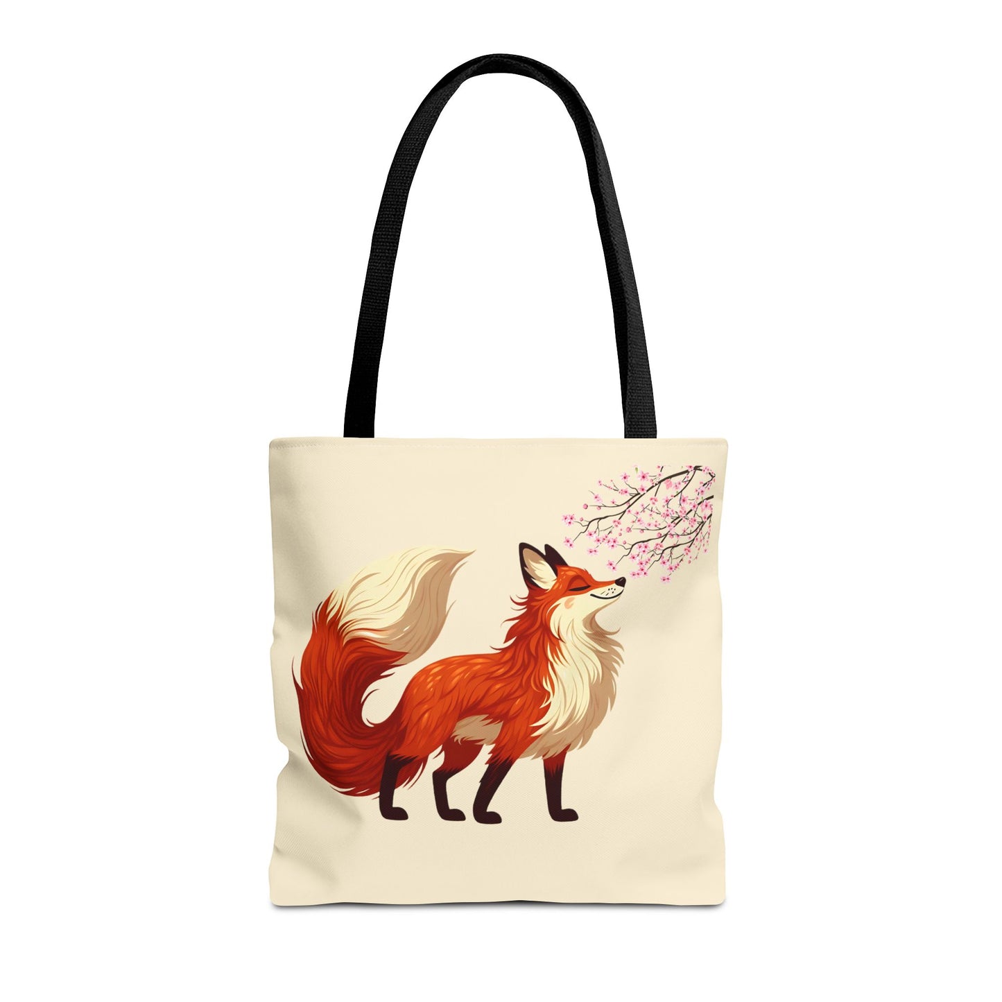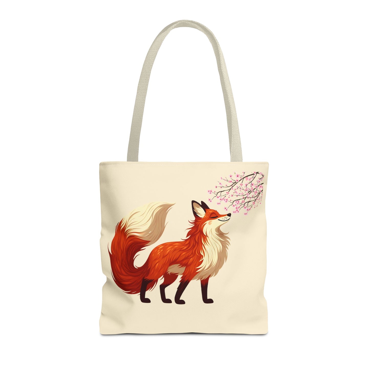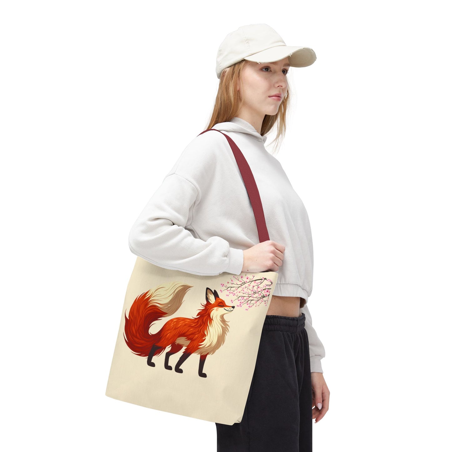 A red fox smelling flowers from a cherry blossom tree branch is depicted in this high resolution graphic that appears on both sides. This cartoon illustration is printed on a tote bag that is perfect for everyday use and comes in 5 color handle options: white, black, red, navy, and beige.