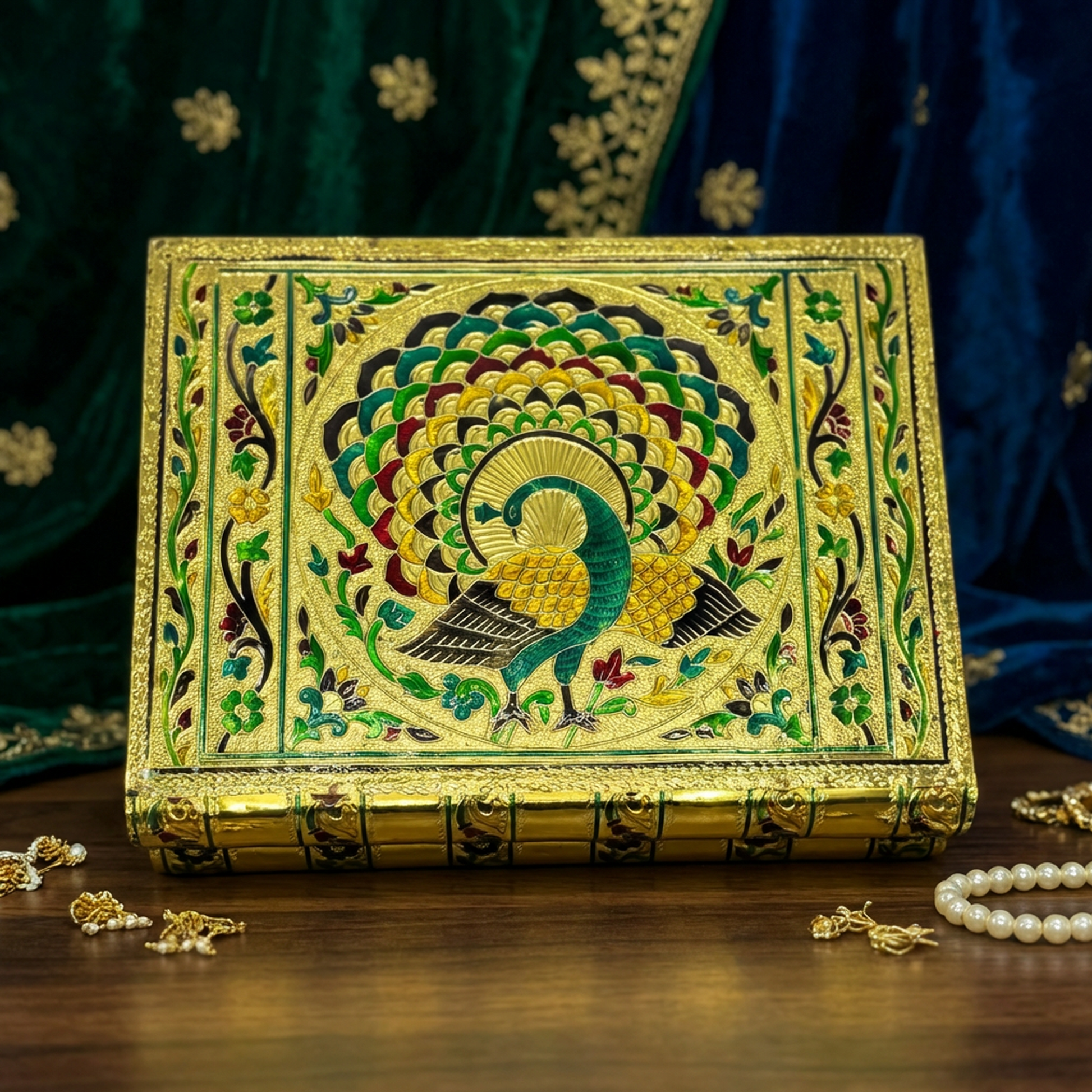 Handmade Luxury Jewelry Box with Meenakari Peacock