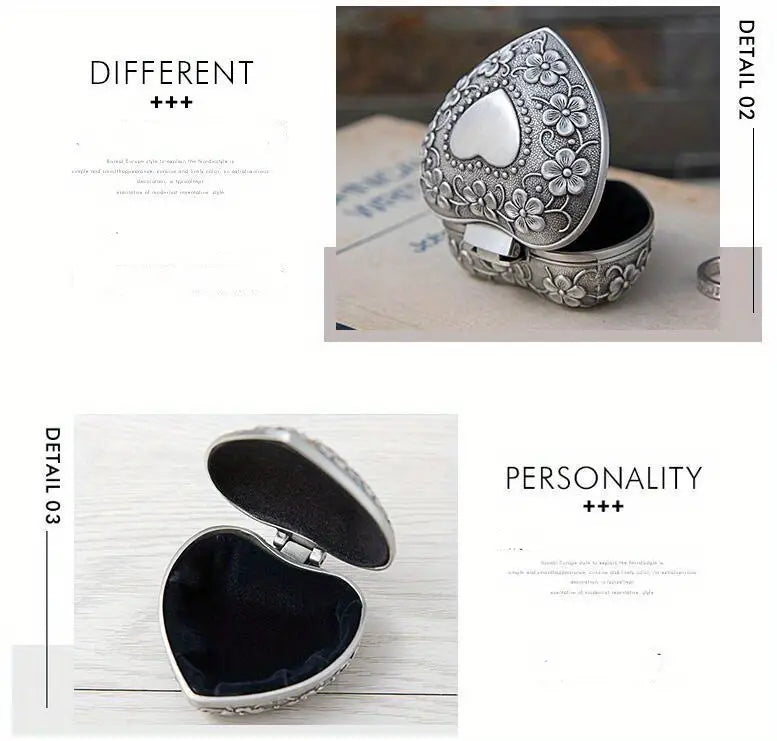 Discover the perfect blend of elegance and practicality with our stunning Heart Shaped Ring Box. Ideal for serving as a ring holder or a portable trinket box to store necklaces, earrings, and other small jewelry pieces when you're in transit. The silver vintage design on the outer shell adds a touch of elegance. Whether you're treating yourself or looking for a thoughtful gift for a loved one, this jewelry box is a perfect choice. Its beautiful design and practical features make it a versatile addition to any jewelry collection. Make your jewelry storage stylish and efficient with our Heart Shaped Ring Box. Order yours today and keep your precious items safe and sound!