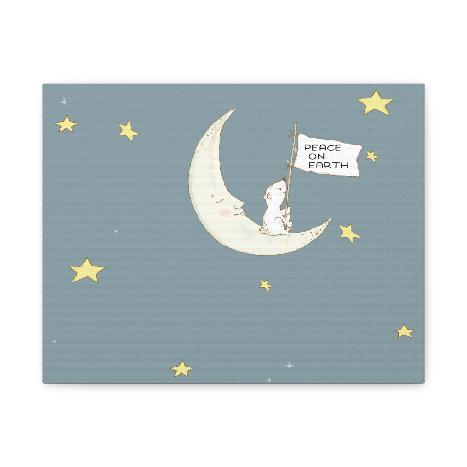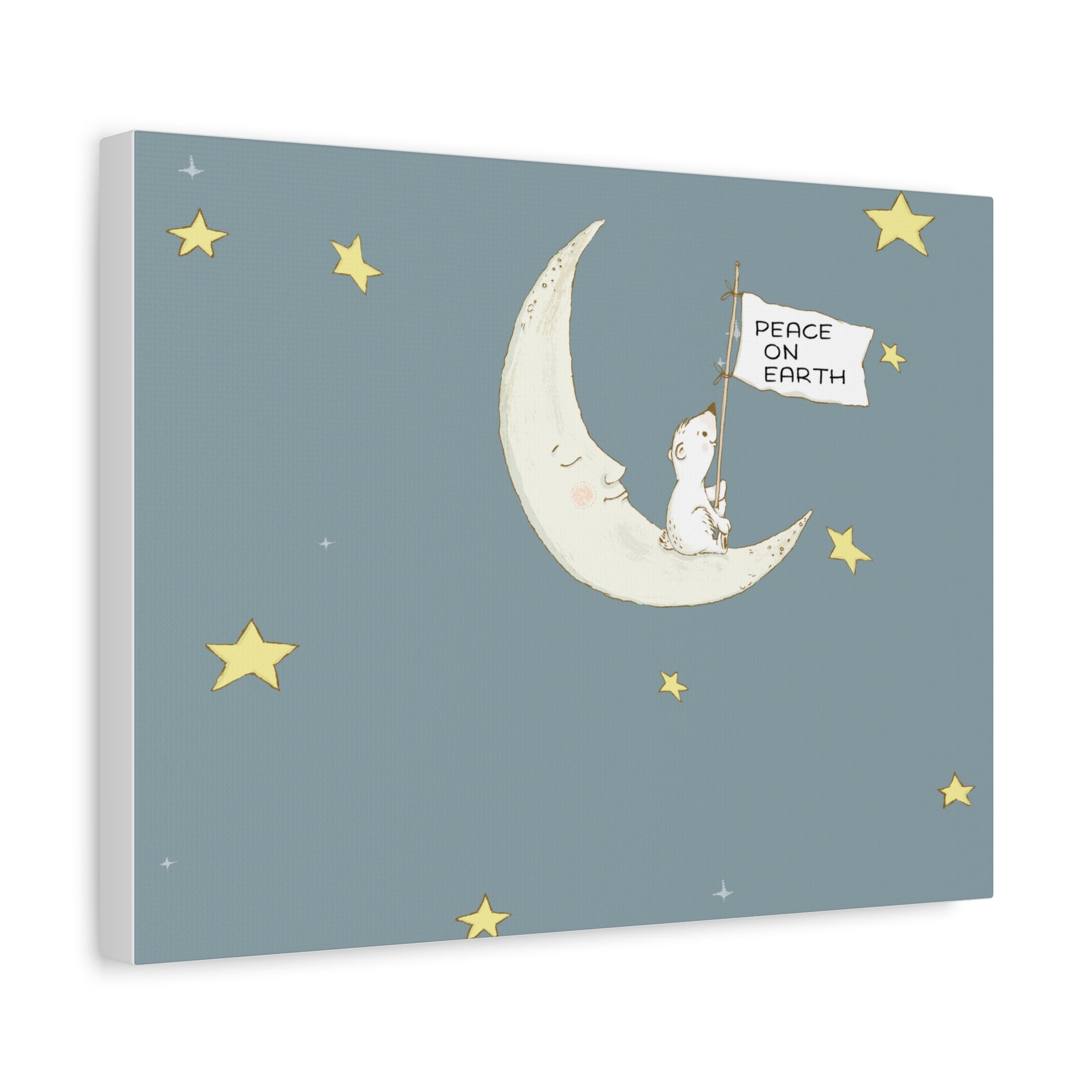 Polar Bear cub is sitting on the moon holding a peace flag. This image is printed on top-quality canvas gallery wraps that are made with finely textured, artist-grade cotton substrate, assuring clarity and detail. These closed back canvases are built with a patented, solid support face and come with hanging hardware. 100% cotton fabric (400gsm). For indoor use only.